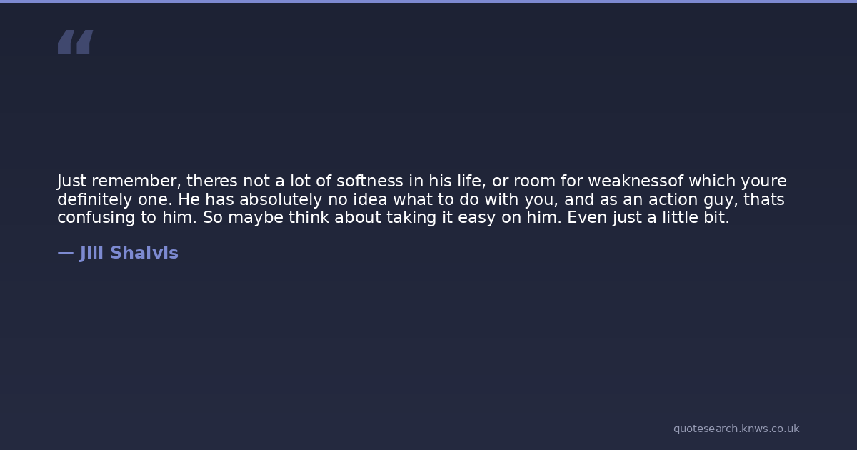 Just remember, theres not a lot of softness in his life, or room for weaknessof which youre definitely one. He has absolutely no idea what to do with you, and as an action guy, thats confusing to him. So maybe think about taking it easy on him. Even just a little bit.
