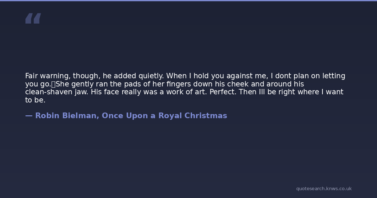 Fair warning, though, he added quietly. When I hold you against me, I dont plan on letting you go. She gently ran the pads of her fingers down his cheek and around his clean-shaven jaw. His face really was a work of art. Perfect. Then Ill be right where I want to be.