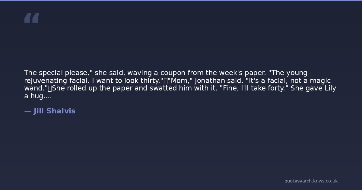 The special please," she said, waving a coupon from the week's paper. "The young rejuvenating facial. I want to look thirty." "Mom," Jonathan said. "It's a facial, not a magic wand." She rolled up the paper and swatted him with it. "Fine, I'll take forty." She gave Lily a hug. "And you! How lovely to see you again!" She turned to Jonathan. "So... you can make me look forty, right?" "How about gorgeous?" Jonathan asked his mom. "Does gorgeous work for you?