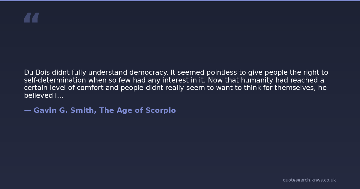 Du Bois didnt fully understand democracy. It seemed pointless to give people the right to self-determination when so few had any interest in it. Now that humanity had reached a certain level of comfort and people didnt really seem to want to think for themselves, he believed it was better that they just did what they were told. Then everyone would be happy.