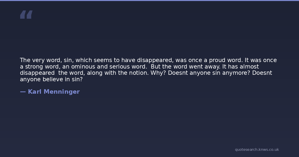 The very word, sin, which seems to have disappeared, was once a proud word. It was once a strong word, an ominous and serious word. But the word went away. It has almost disappeared the word, along with the notion. Why? Doesnt anyone sin anymore? Doesnt anyone believe in sin?