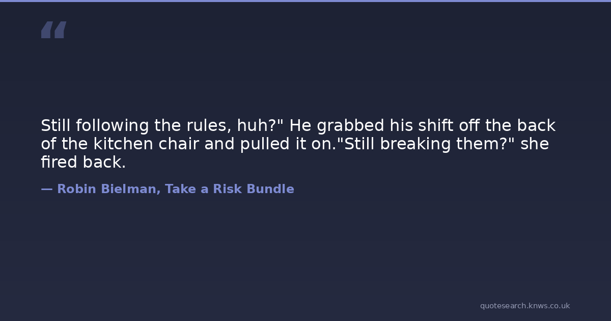 Still following the rules, huh?" He grabbed his shift off the back of the kitchen chair and pulled it on."Still breaking them?" she fired back.