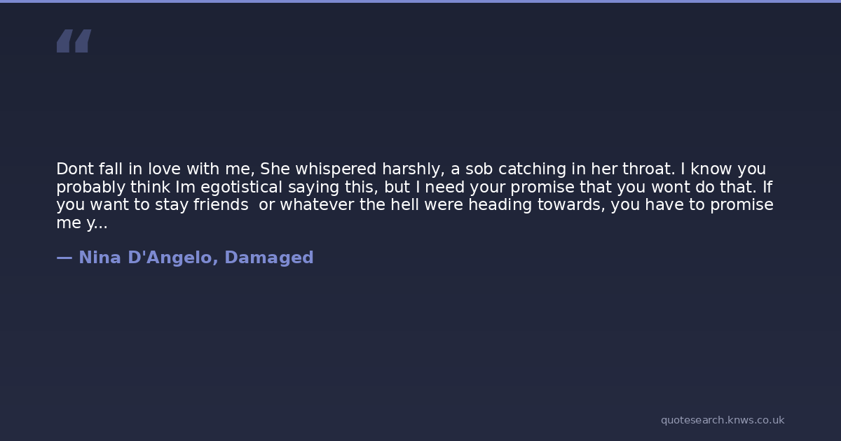 Dont fall in love with me, She whispered harshly, a sob catching in her throat. I know you probably think Im egotistical saying this, but I need your promise that you wont do that. If you want to stay friends or whatever the hell were heading towards, you have to promise me you wont love me not now, not ever. - Stephanie Carovella, Damaged.