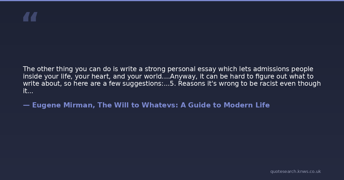 The other thing you can do is write a strong personal essay which lets admissions people inside your life, your heart, and your world....Anyway, it can be hard to figure out what to write about, so here are a few suggestions:...5. Reasons it's wrong to be racist even though it makes sense to you.