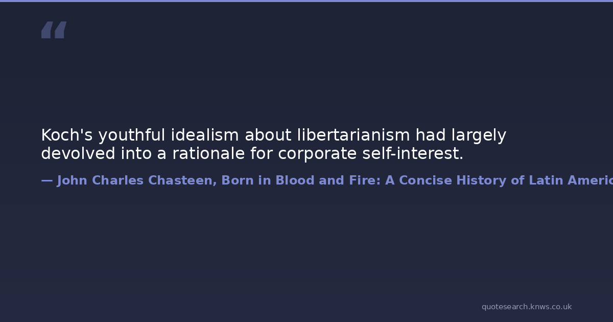 Koch's youthful idealism about libertarianism had largely devolved into a rationale for corporate self-interest. corporate-greed evolution Download Image Share on X Share on Facebook Copy Link