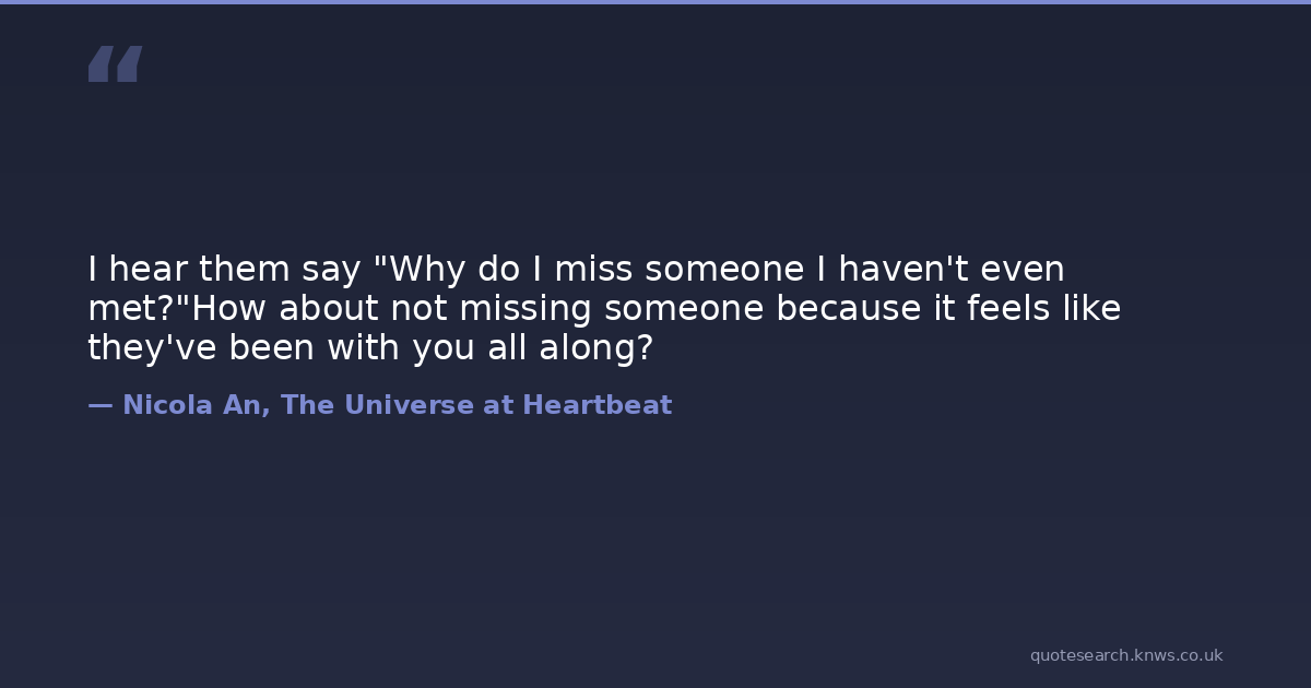 I hear them say "Why do I miss someone I haven't even met?"How about not missing someone because it feels like they've been with you all along?