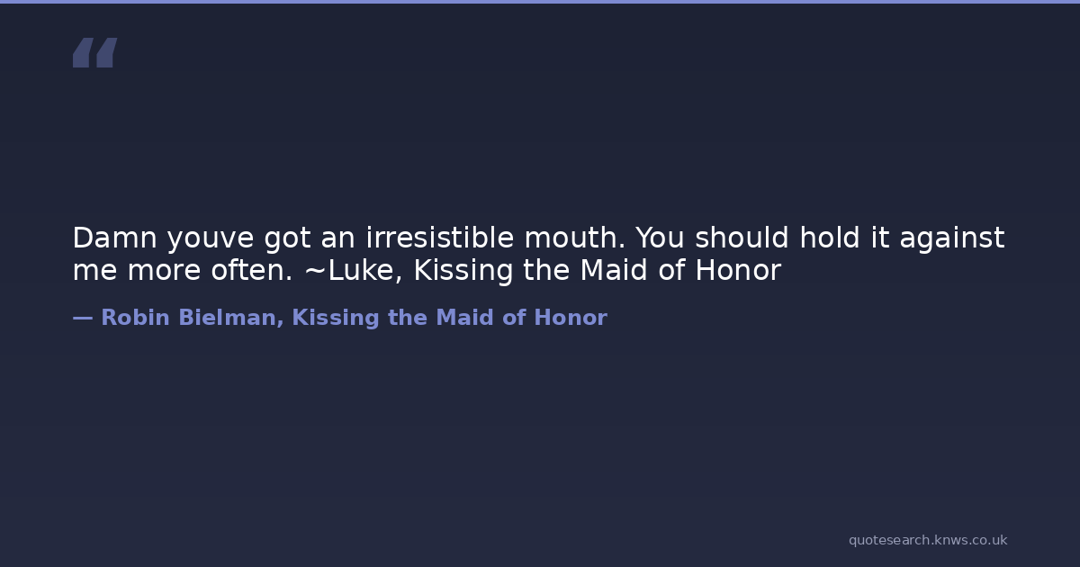 Damn youve got an irresistible mouth. You should hold it against me more often. ~Luke, Kissing the Maid of Honor beach-read contemporary-romance wedding Download Image Share on X Share on Facebook Copy Link