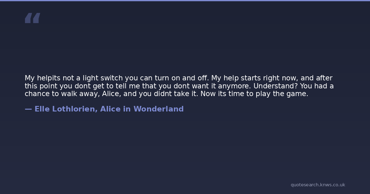 My helpits not a light switch you can turn on and off. My help starts right now, and after this point you dont get to tell me that you dont want it anymore. Understand? You had a chance to walk away, Alice, and you didnt take it. Now its time to play the game.