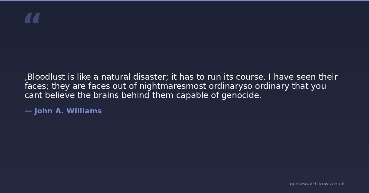 ,Bloodlust is like a natural disaster; it has to run its course. I have seen their faces; they are faces out of nightmaresmost ordinaryso ordinary that you cant believe the brains behind them capable of genocide.