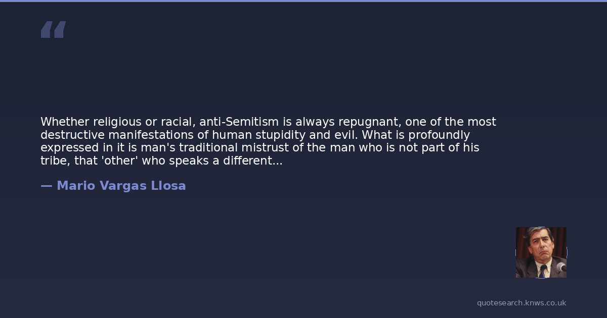 Whether religious or racial, anti-Semitism is always repugnant, one of the most destructive manifestations of human stupidity and evil. What is profoundly expressed in it is man's traditional mistrust of the man who is not part of his tribe, that 'other' who speaks a different language, whose skin is a different color, and who participates in mysterious rites and rituals.