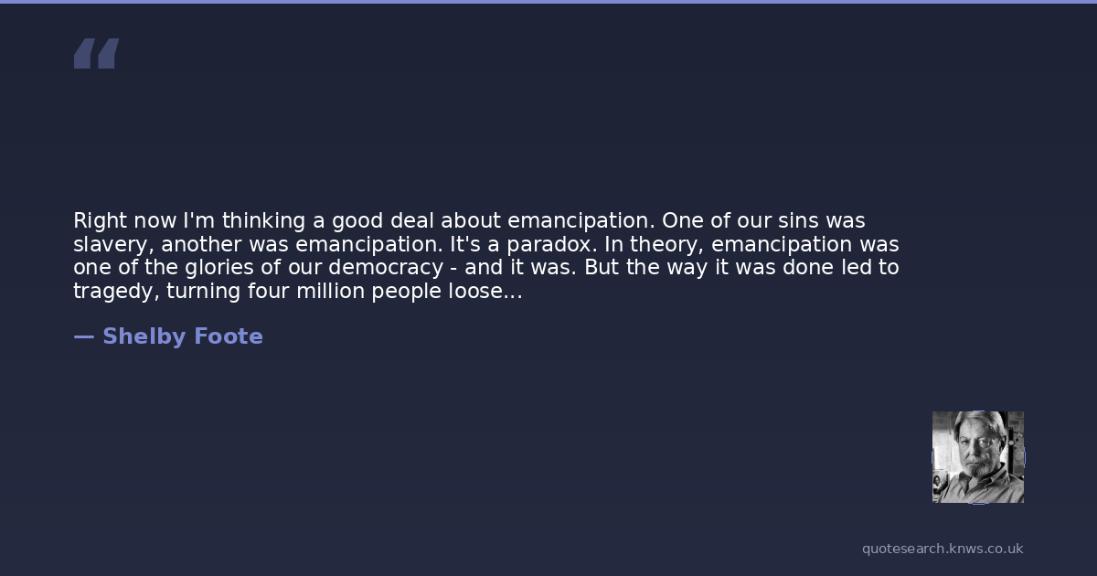 Right now I'm thinking a good deal about emancipation. One of our sins was slavery, another was emancipation. It's a paradox. In theory, emancipation was one of the glories of our democracy - and it was. But the way it was done led to tragedy, turning four million people loose with no jobs or trades or learning. And then in 1877 for a few electoral votes, just abandoning them entirely. A huge amount of pain and trouble resulted. Everybody in America is still paying for it.