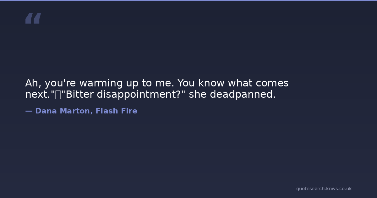 Ah, you're warming up to me. You know what comes next." "Bitter disappointment?" she deadpanned.