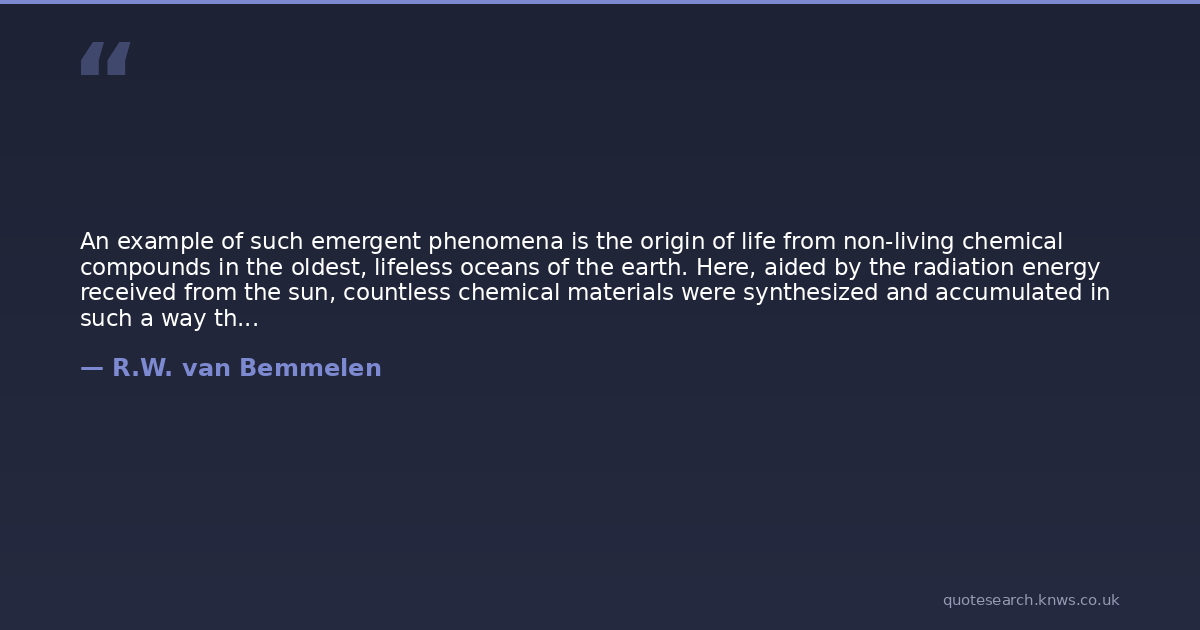 An example of such emergent phenomena is the origin of life from non-living chemical compounds in the oldest, lifeless oceans of the earth. Here, aided by the radiation energy received from the sun, countless chemical materials were synthesized and accumulated in such a way that they constituted, as it were, a primeval soup. In this primeval soup, by infinite variations of lifeless growth and decay of substances during some billions of years, the way of life was ultimately reached, with its metabolism characterized by selective assimilation and dissimilation as end stations of a sluiced and canalized flow of free chemical energy.