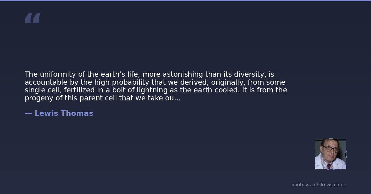 The uniformity of the earth's life, more astonishing than its diversity, is accountable by the high probability that we derived, originally, from some single cell, fertilized in a bolt of lightning as the earth cooled. It is from the progeny of this parent cell that we take our looks; we still share genes around, and the resemblance of the enzymes of grasses to those of whales is a family resemblance.