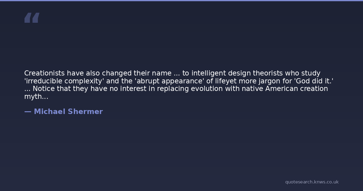 Creationists have also changed their name ... to intelligent design theorists who study 'irreducible complexity' and the 'abrupt appearance' of lifeyet more jargon for 'God did it.' ... Notice that they have no interest in replacing evolution with native American creation myths or including the Code of Hammurabi alongside the posting of the Ten Commandments in public schools.