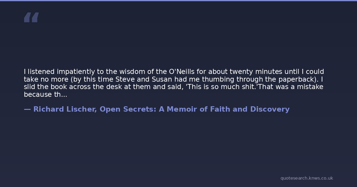 I listened impatiently to the wisdom of the O'Neills for about twenty minutes until I could take no more (by this time Steve and Susan had me thumbing through the paperback). I slid the book across the desk at them and said, 'This is so much shit.'That was a mistake because the word 'shit' on the lips of a pastor deeply offended their moral sensibilities. Such was the state of things among us. They took grave exception to the word SHIT, while I was expected to remain noddingly neutral toward their adultery. WELL, SHIT, I thought. Without apologizing, I tried to convince them I was merely 'upset' by the prospects of their separation. Gradually, I achieved the clinical tone that they so admired in the O'Neills and evidently expected in their country parson.