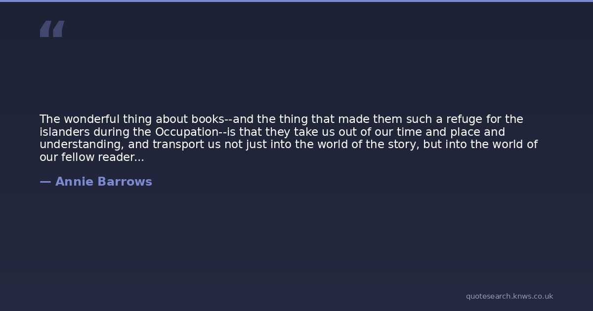 The wonderful thing about books--and the thing that made them such a refuge for the islanders during the Occupation--is that they take us out of our time and place and understanding, and transport us not just into the world of the story, but into the world of our fellow readers, who have stories of their own.
