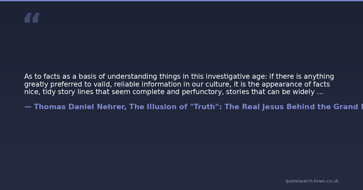 As to facts as a basis of understanding things in this investigative age: if there is anything greatly preferred to valid, reliable information in our culture, it is the appearance of facts nice, tidy story lines that seem complete and perfunctory, stories that can be widely circulated in mutual agreement, despite lacking validity. And, as there are absolutely no historical facts concerning the life of Jesus of Nazareth not a single word about him recorded during his lifetime Christianity provides such a wonderful substitute appearance.