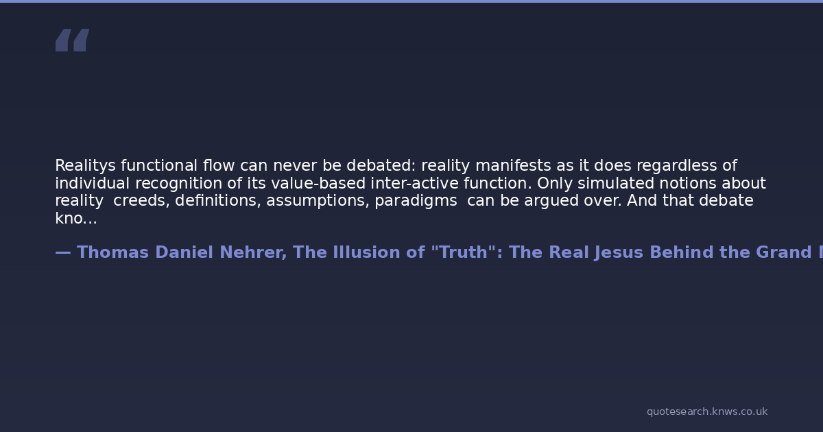 Realitys functional flow can never be debated: reality manifests as it does regardless of individual recognition of its value-based inter-active function. Only simulated notions about reality creeds, definitions, assumptions, paradigms can be argued over. And that debate knows neither end nor resolution, as each arguing party hosts a personally customized fantasy with each appearing unwaveringly valid to the holder.