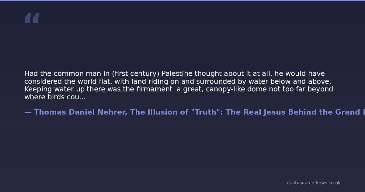 Had the common man in (first century) Palestine thought about it at all, he would have considered the world flat, with land riding on and surrounded by water below and above. Keeping water up there was the firmament a great, canopy-like dome not too far beyond where birds could fly. Indeed, the firmament had gates for the sun and moon to go through, and through which water fell as rain from the waters above.