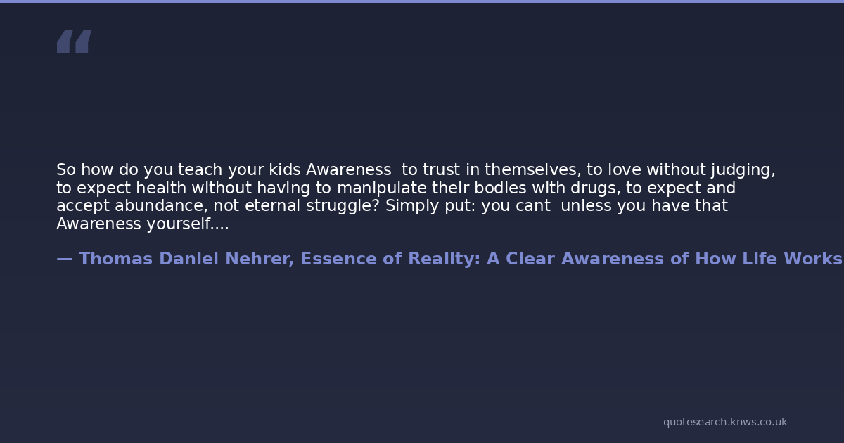 So how do you teach your kids Awareness to trust in themselves, to love without judging, to expect health without having to manipulate their bodies with drugs, to expect and accept abundance, not eternal struggle? Simply put: you cant unless you have that Awareness yourself. In that case, youdont have to do anything just be yourself.