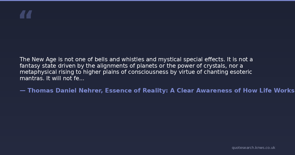 The New Age is not one of bells and whistles and mystical special effects. It is not a fantasy state driven by the alignments of planets or the power of crystals, nor a metaphysical rising to higher plains of consciousness by virtue of chanting esoteric mantras. It will not feature the arrival of a thunderbolt-wielding god, ready to set up a final judgment by reviving hordes of old, decayed corpses. The real New Age is a simple, but stunningly profound, awareness that ones Self and all that one encounters are two aspects of the same, singular Essence.