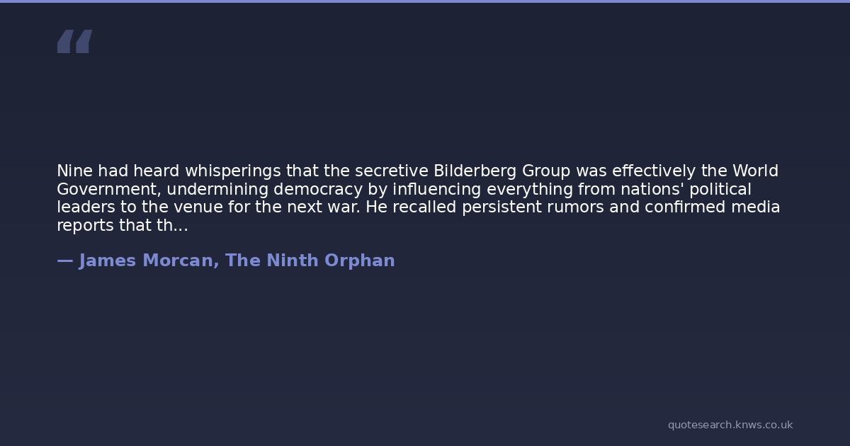Nine had heard whisperings that the secretive Bilderberg Group was effectively the World Government, undermining democracy by influencing everything from nations' political leaders to the venue for the next war. He recalled persistent rumors and confirmed media reports that the Bilderberg Group had such luminaries as Barack Obama, Prince Charles, Bill Gates, Rupert Murdoch, Tony Blair, Bill and Hillary Clinton, George Bush Sr. and George W. Bush. Other Bilderberg members sprung forth from Nines memory bank. They included the founders and CEOs of various multinational corporations like Facebook, BP, Google, Shell and Amazon, as well as almost every major financial institution on the planet.