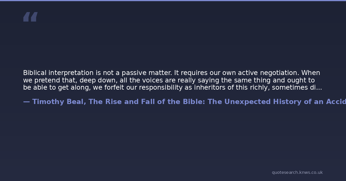 Biblical interpretation is not a passive matter. It requires our own active negotiation. When we pretend that, deep down, all the voices are really saying the same thing and ought to be able to get along, we forfeit our responsibility as inheritors of this richly, sometimes disturbingly, contradictive literature.