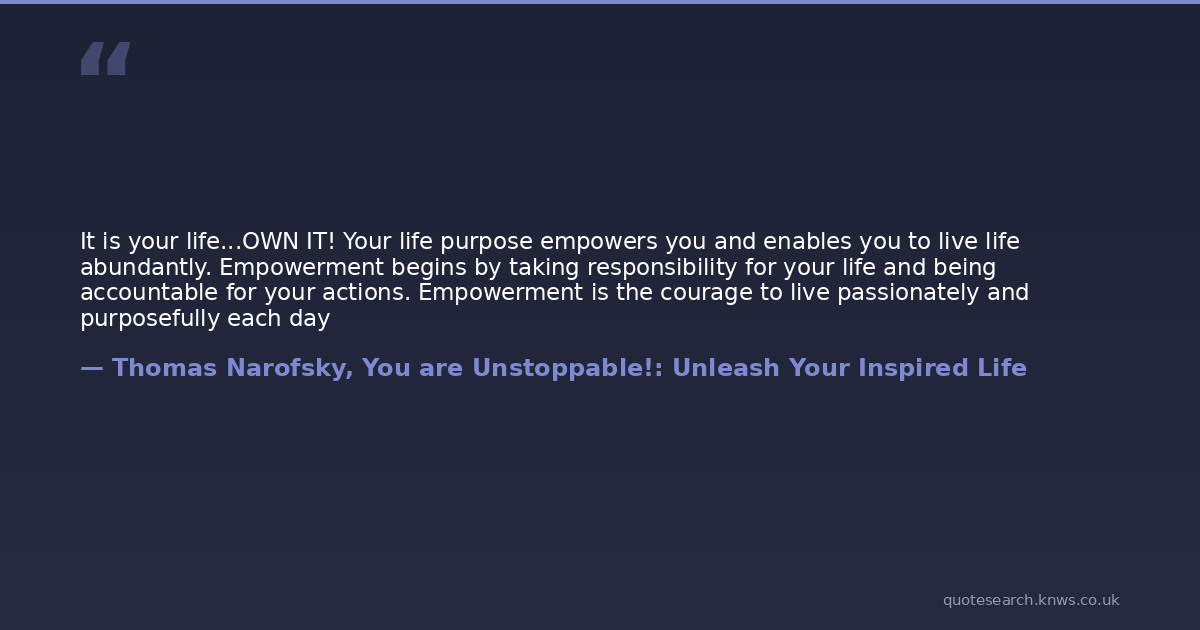 It is your life...OWN IT! Your life purpose empowers you and enables you to live life abundantly. Empowerment begins by taking responsibility for your life and being accountable for your actions. Empowerment is the courage to live passionately and purposefully each day