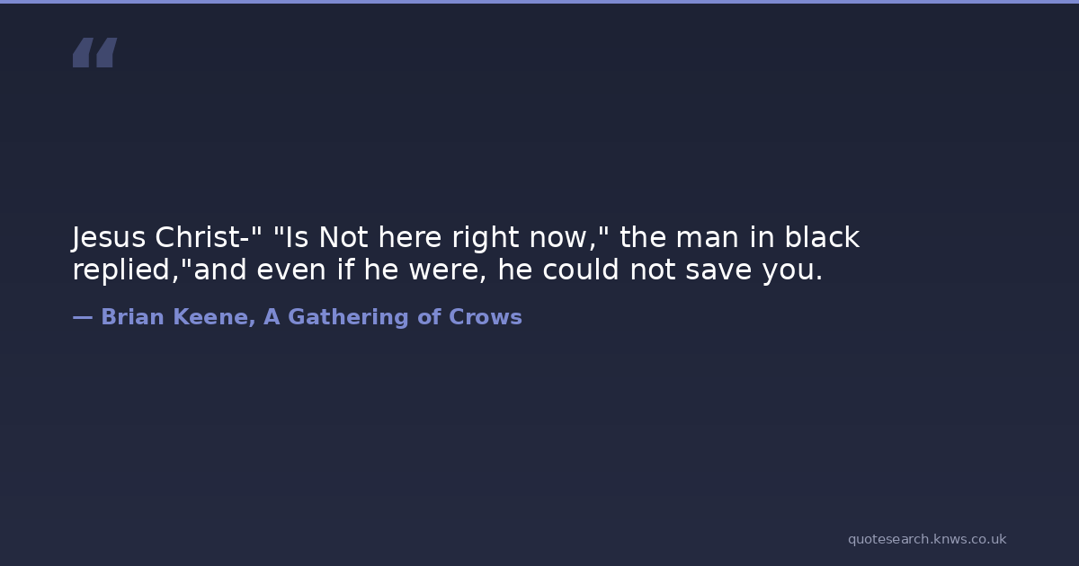 Jesus Christ-" "Is Not here right now," the man in black replied,"and even if he were, he could not save you. a-gathering-of-crows brian-keene horror Download Image Share on X Share on Facebook Copy Link