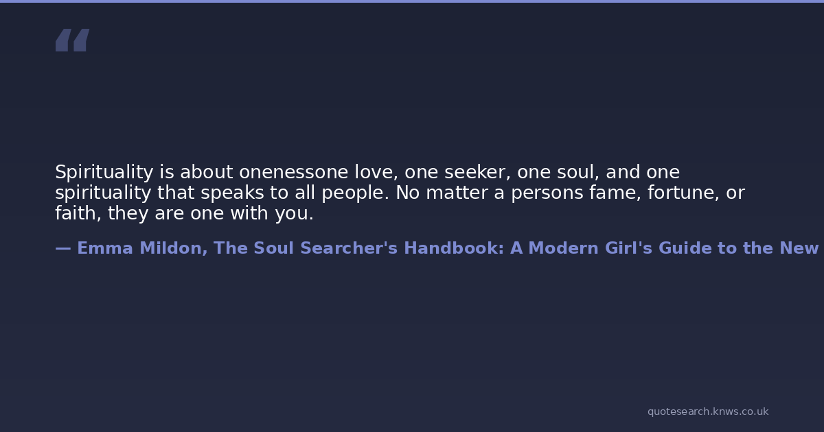 Spirituality is about onenessone love, one seeker, one soul, and one spirituality that speaks to all people. No matter a persons fame, fortune, or faith, they are one with you.