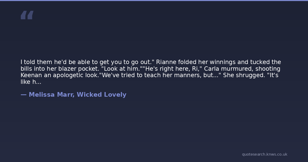 I told them he'd be able to get you to go out." Rianne folded her winnings and tucked the bills into her blazer pocket. "Look at him.""He's right here, Ri," Carla murmured, shooting Keenan an apologetic look."We've tried to teach her manners, but..." She shrugged. "It's like housebreaking a dog. If we'd had her when she was a puppy, maybe."Rianne smacked her on the arm, but she was grinning. "Woof, woof.