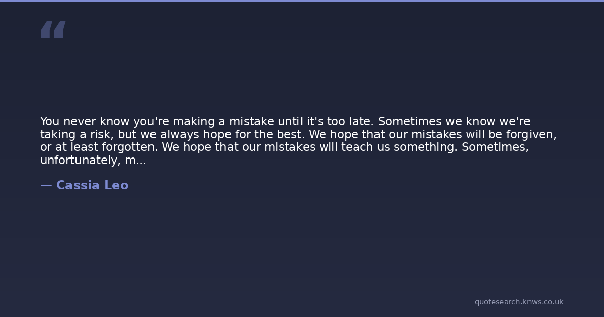 You never know you're making a mistake until it's too late. Sometimes we know we're taking a risk, but we always hope for the best. We hope that our mistakes will be forgiven, or at least forgotten. We hope that our mistakes will teach us something. Sometimes, unfortunately, mistakes are just mistakes that can't be undone or forgotten.