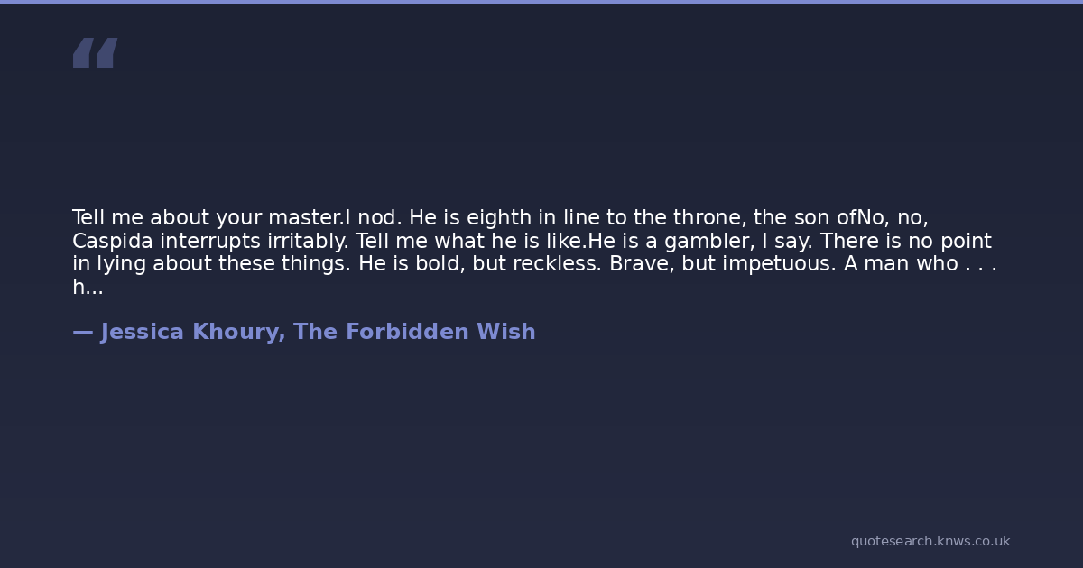 Tell me about your master.I nod. He is eighth in line to the throne, the son ofNo, no, Caspida interrupts irritably. Tell me what he is like.He is a gambler, I say. There is no point in lying about these things. He is bold, but reckless. Brave, but impetuous. A man who . . . holds grudges. Pausing, I finish in a whisper, He would risk his life to save someone else, without even thinking twice.Caspida turns her head a bit, interest growing in her eyes. And he sets out on a mad voyage and sails straight into a nest of jinn.My master is noble, I say with a smile, but I made no suggestions as to his intelligence.