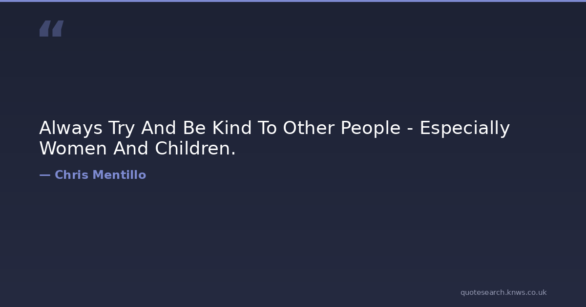 Always Try And Be Kind To Other People - Especially Women And Children. chris-mentillo chris-mentillo-books chris-mentillo-goodreads chris-mentillo-quotes famous-authors-and-books famous-people famous-people-quotes famous-people-writings famous-writers horror horror-books Download Image Share on X Share on Facebook Copy Link