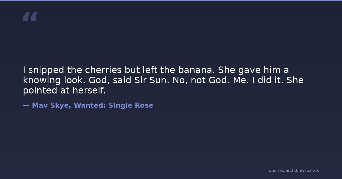 I snipped the cherries but left the banana. She gave him a knowing look. God, said Sir Sun. No, not God. Me. I did it. She pointed at herself.