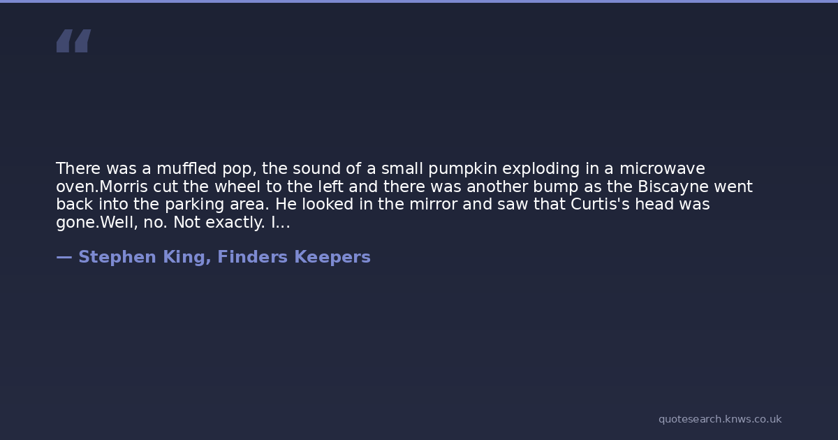 There was a muffled pop, the sound of a small pumpkin exploding in a microwave oven.Morris cut the wheel to the left and there was another bump as the Biscayne went back into the parking area. He looked in the mirror and saw that Curtis's head was gone.Well, no. Not exactly. It was there, but all spread out. Mooshed. No loss of talent in that mess. Morrie thought.