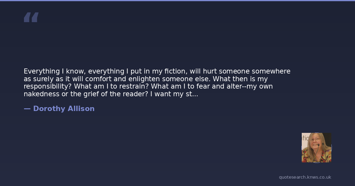 Everything I know, everything I put in my fiction, will hurt someone somewhere as surely as it will comfort and enlighten someone else. What then is my responsibility? What am I to restrain? What am I to fear and alter--my own nakedness or the grief of the reader? I want my stories to be so good they are unforgettable; to make my ideas live and my own terrors real for people I will never meet. It is a completely amoral writer's lust. If we begin to agree that some ideas are too dangerous, too bad to invite inside our heads, then we stop the storyteller completely. We silence everyone who would tell us something that might be painful in our vulnerable moments.