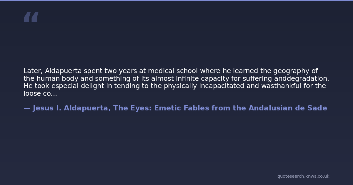 Later, Aldapuerta spent two years at medical school where he learned the geography of the human body and something of its almost infinite capacity for suffering anddegradation. He took especial delight in tending to the physically incapacitated and wasthankful for the loose coats that prevented the matrona from spotting the engorged cock that I would occasionally press against the bedridden patient.