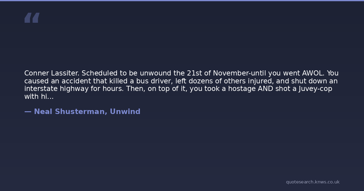 Conner Lassiter. Scheduled to be unwound the 21st of November-until you went AWOL. You caused an accident that killed a bus driver, left dozens of others injured, and shut down an interstate highway for hours. Then, on top of it, you took a hostage AND shot a Juvey-cop with his own tranq gun."..."He's the Akron AWOL?!