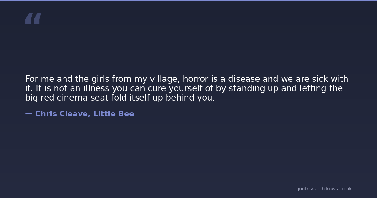 For me and the girls from my village, horror is a disease and we are sick with it. It is not an illness you can cure yourself of by standing up and letting the big red cinema seat fold itself up behind you.