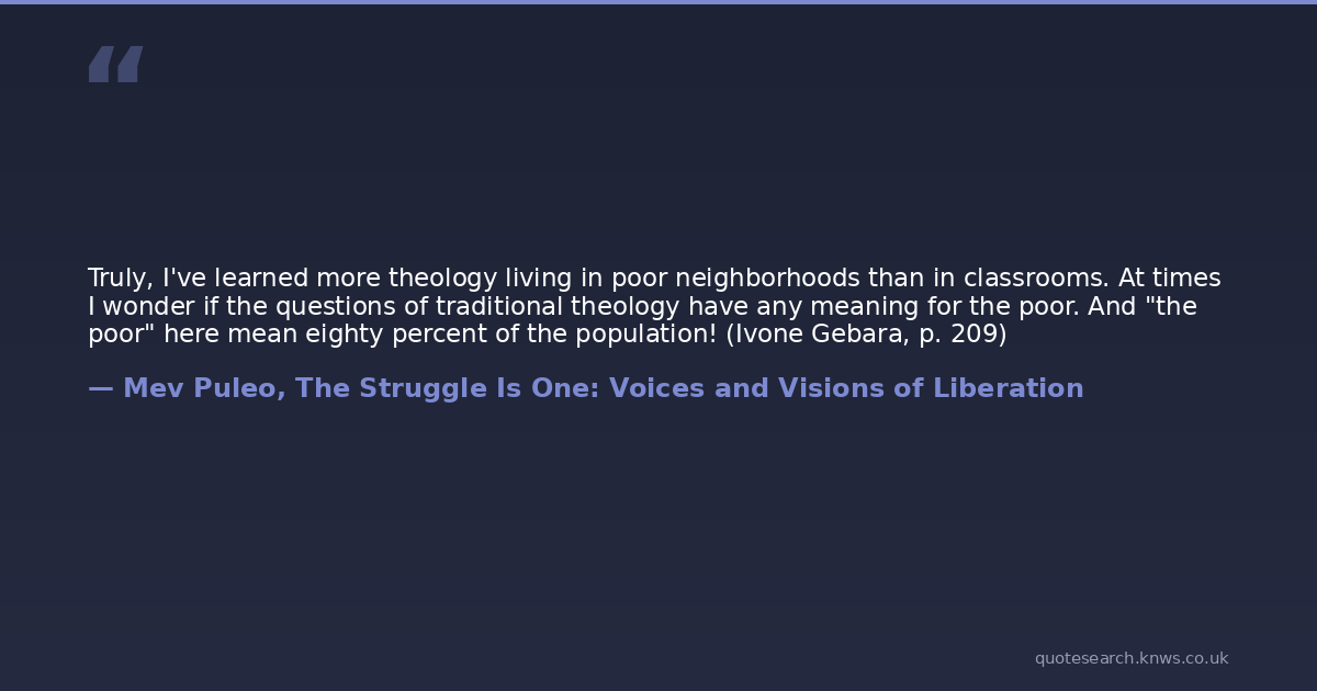 Truly, I've learned more theology living in poor neighborhoods than in classrooms. At times I wonder if the questions of traditional theology have any meaning for the poor. And "the poor" here mean eighty percent of the population! (Ivone Gebara, p. 209)