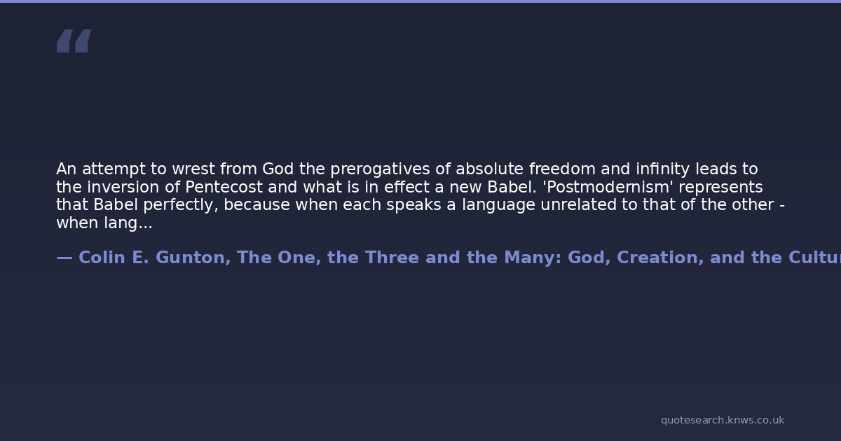An attempt to wrest from God the prerogatives of absolute freedom and infinity leads to the inversion of Pentecost and what is in effect a new Babel. 'Postmodernism' represents that Babel perfectly, because when each speaks a language unrelated to that of the other - when language is not the basis of the communication that shapes our being - the only outcome can be fragmentation. In that sense, postmodernism is modernity come home to roost.