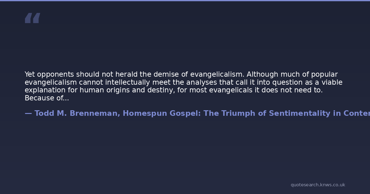 Yet opponents should not herald the demise of evangelicalism. Although much of popular evangelicalism cannot intellectually meet the analyses that call it into question as a viable explanation for human origins and destiny, for most evangelicals it does not need to. Because of the transition from comprehending their religion as a set of doctrines to conceptualizing their religion as an emotional relationship with God, evangelicals have actually made their religion more resilient to intellectual challenges. Calling into question evangelicalism's intellectual foundation ultimately does not undermine the religion because for many evangelicals their adherence was never about those foundations anyway. Evangelicalism becomes true because it FEELS true. Modern evangelicalism has largely transitioned to a new form of truth, one based not on intellectual assent to propositions but on emotional connections.