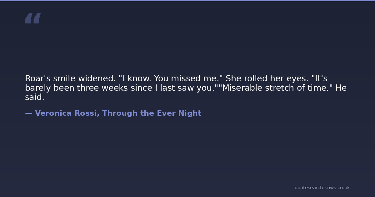 Roar's smile widened. "I know. You missed me." She rolled her eyes. "It's barely been three weeks since I last saw you.""Miserable stretch of time." He said.