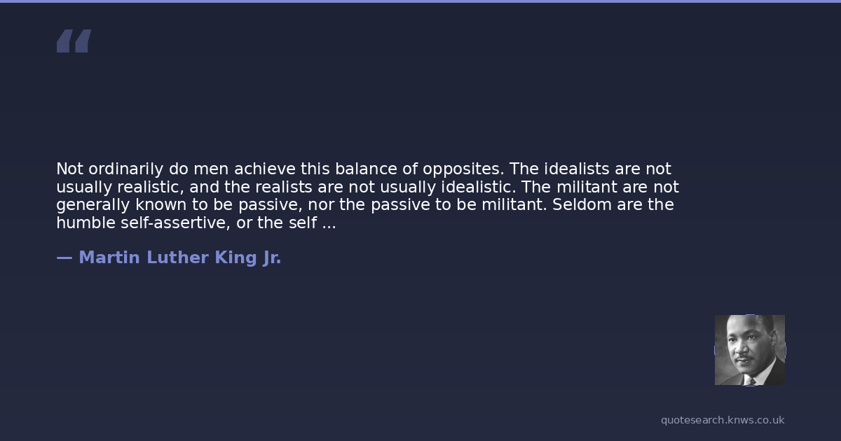 Not ordinarily do men achieve this balance of opposites. The idealists are not usually realistic, and the realists are not usually idealistic. The militant are not generally known to be passive, nor the passive to be militant. Seldom are the humble self-assertive, or the self assertive humble. ...truth is found neither in the thesis nor the antithesis, but in an emergent synthesis that reconciles the two.