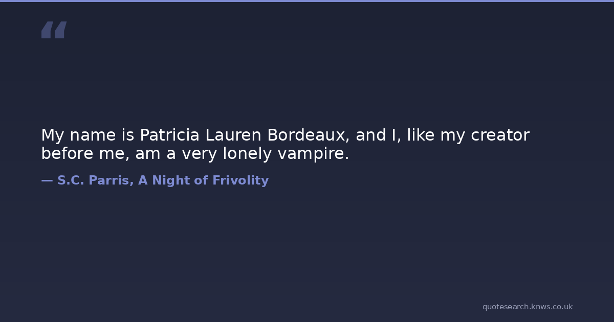 My name is Patricia Lauren Bordeaux, and I, like my creator before me, am a very lonely vampire. ebook horror patricia-clarke patricia-lauren-clarke short-story vampires Download Image Share on X Share on Facebook Copy Link