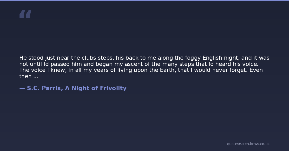 He stood just near the clubs steps, his back to me along the foggy English night, and it was not until Id passed him and began my ascent of the many steps that Id heard his voice. The voice I knew, in all my years of living upon the Earth, that I would never forget. Even then I had known this. It was the slippery way of his tongue, or perhaps it was the coolness of which his words passed across the air and slid its way into my ears as though they were only meant for me.