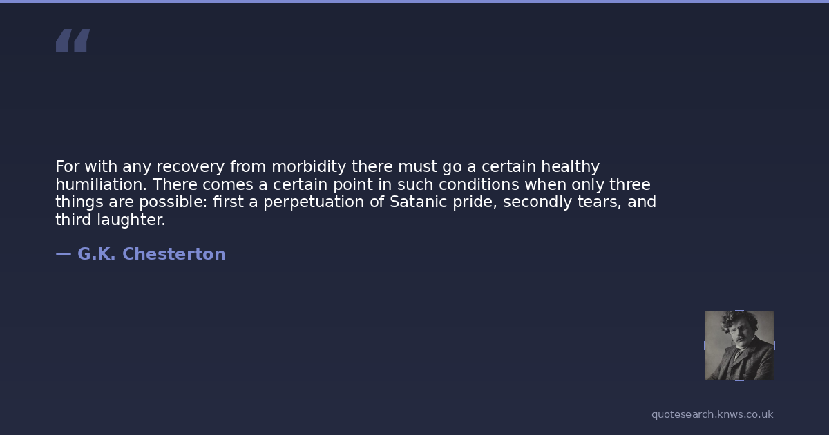 For with any recovery from morbidity there must go a certain healthy humiliation. There comes a certain point in such conditions when only three things are possible: first a perpetuation of Satanic pride, secondly tears, and third laughter.