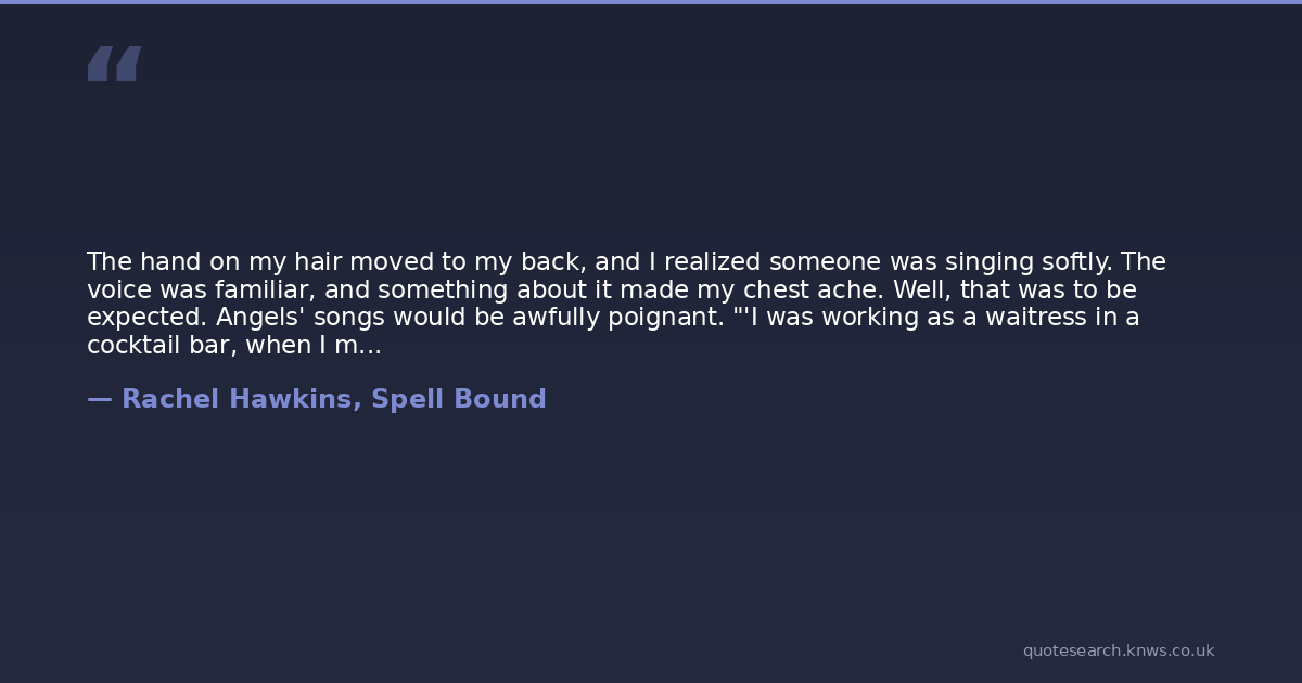The hand on my hair moved to my back, and I realized someone was singing softly. The voice was familiar, and something about it made my chest ache. Well, that was to be expected. Angels' songs would be awfully poignant. "'I was working as a waitress in a cocktail bar, when I met you...'" the voice crooned. I frowned. Was that really an appropriate song for the Heavenly Host to be--